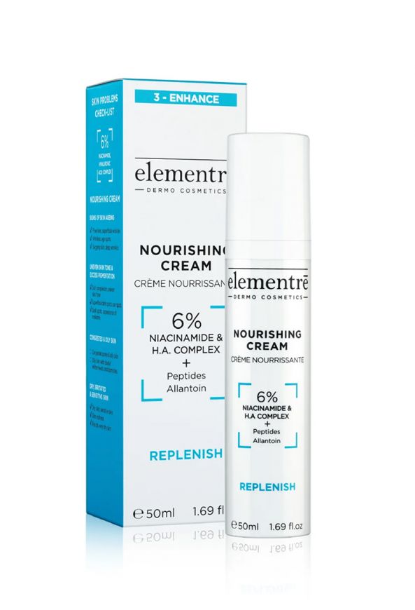 Elementrē Nourishing Cream kosteuttaa ihoa syvältä ja palauttaa sen miellyttävyyden ja joustavuuden tehokkaasti kosteuttavien ja tulehdusta ehkäisevien ainesosien, hyaluronihapon ja niasiiniamidin yhdistelmän ansiosta. Syväkosteuttaa ja rauhoittaa ihoa. Peptidit ja allantoiini auttavat vahvistamaan ihon kollageenin ja elastiinin tuotantoa, mikä tekee ihosta kestävämmän ja tasaisemman. Nourishing Cream -voide on ainutlaatuinen kevyen koostumuksensa ansiosta, joka kosteuttaa ja rauhoittaa ihoa tehokkaasti tuntumatta raskaalta. Sopii kaikille ihotyypeille, myös akneen taipuvaiselle tai punoittavalle iholle.