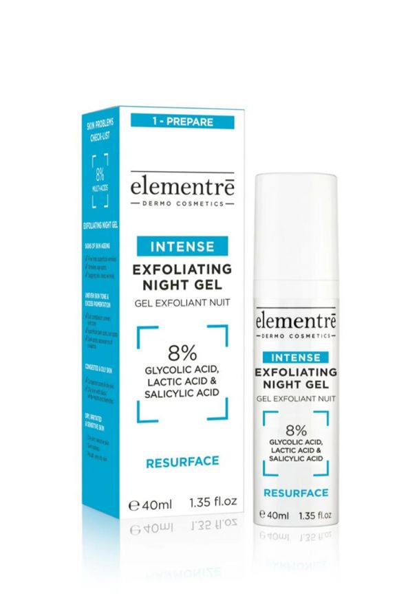 Elementrē Exfoliating Night Gel syväpuhdistaa ja kuorii ihoa alfa- ja betahydroksihappojen optimaalisella annoksella ja yhdistelmällä. Yhdistelmä 8 % glykolihappoa, 3,3 % maitohappoa ja 0,2 % BHA-happoa auttaa ehkäisemään tulehduksia ja aknea samalla kun tuote stimuloi kollageenin ja elastiinin tuotantoa ikääntymiseen liittyvien merkkien torjumiseksi. Sen ensiluokkainen koostumus tuntuu ylelliseltä ja tekee ihosta raikkaan, sileän ja tasapainoisen.